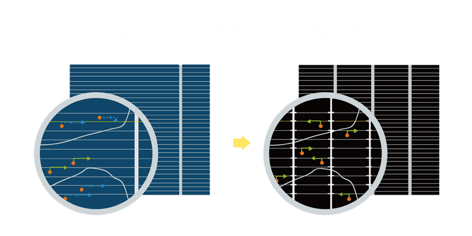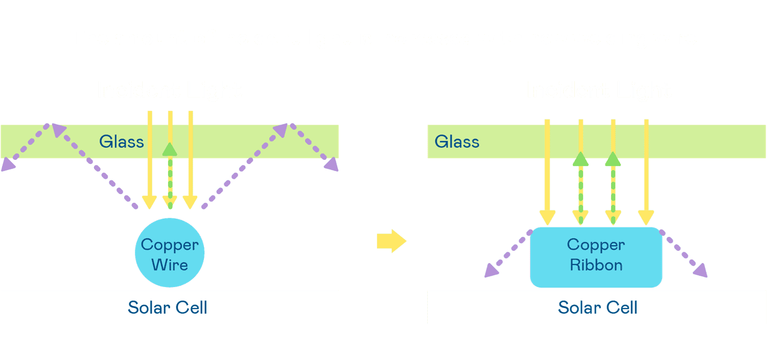• 电池使用多条铜导线 (Copper wire) 于电池片上形成较短的电流路径,,提高电流收集效率,,,采用圆形设计的铜导线较传统扁平式的铜焊带 (Ribbon),,可增加入射至电池的光线量。。。
