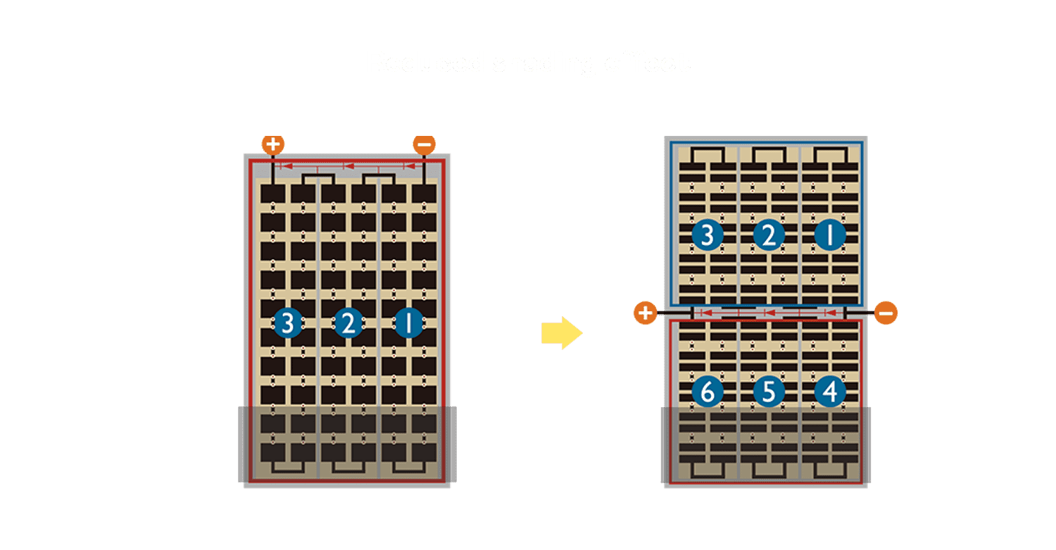 • 结合半切电池,,,降低遮阴影响、、、、提升模组抗隐裂能力、、、并减少电阻损耗,,,,进一步提升模组发电效能。。。